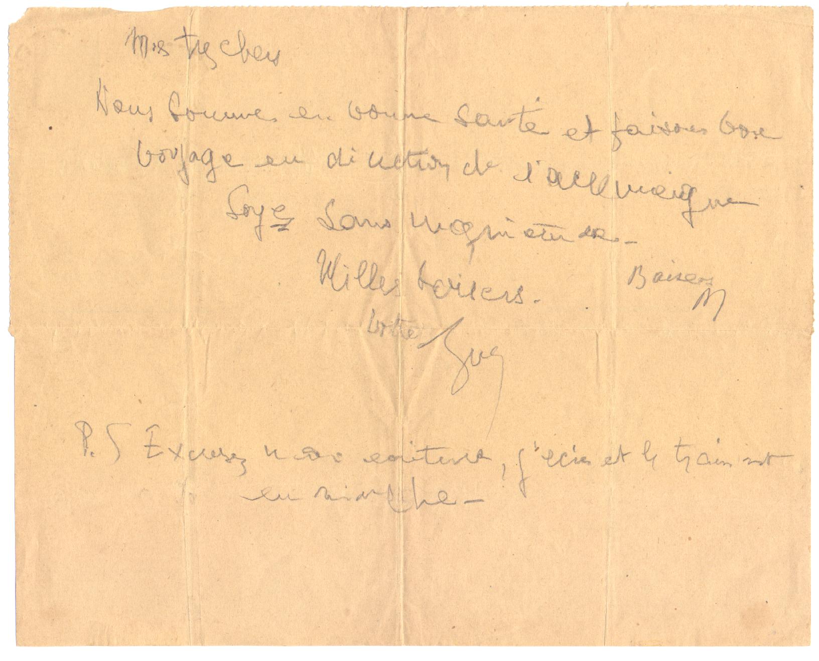 (מכתב שכנראה נמסר לאלמוני באחת מהתחנות בהן עצרה הרכבת ונשלחה למשפחה)